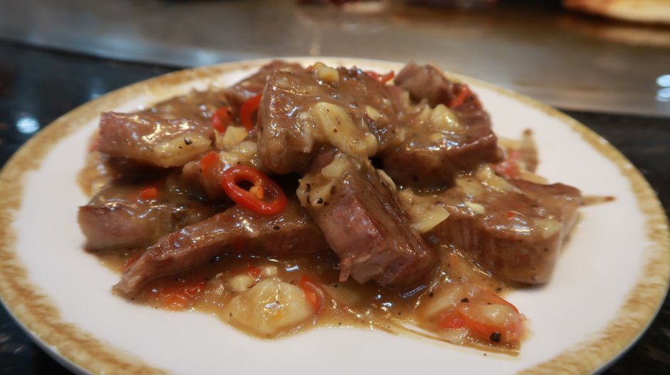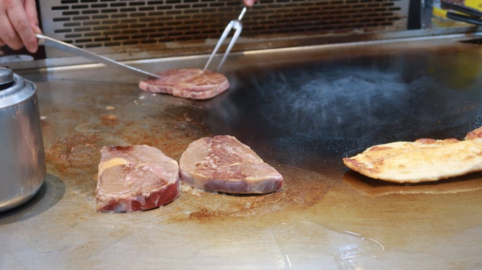 主餐丟上鐵板檯了!我瞄了一眼,嘴角不禁上揚了起來。( ╹ਊ╹) ( 果然是我職涯裏面沒有看過的肉呢~)啊就重組肉啊不然牛排跟豬排再怎麼塑型也不是那個形狀啦!