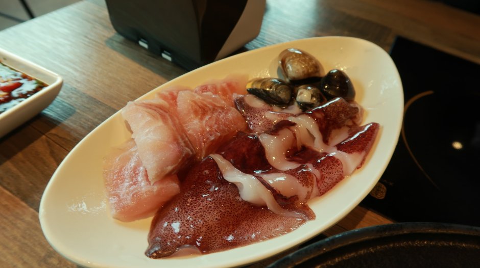 這次有吃到以麻油炒鍋的三種主餐,板腱牛、伊比利豬肋、白蝦。