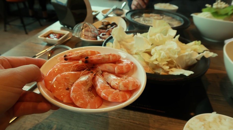 我點的蝦子炒過之後,是直接加湯變成火鍋湯底。湯裡面有炒蝦殼的鮮,後來又加了蛤蠣熬過之後,湯味頗鮮。(=゚▽゚)/