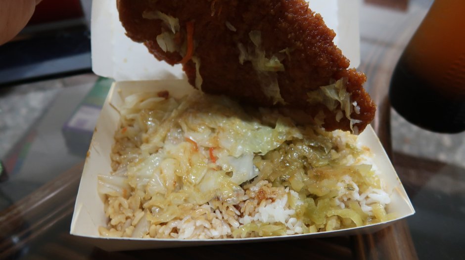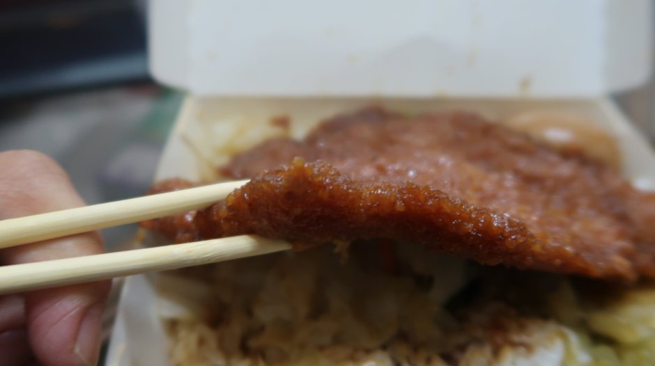 一塊炸過的滷排骨,下面放甜甜的漬菜、炒過的高麗菜、一顆滷蛋,然後就是滷汁飯。