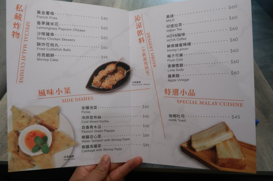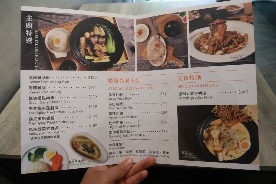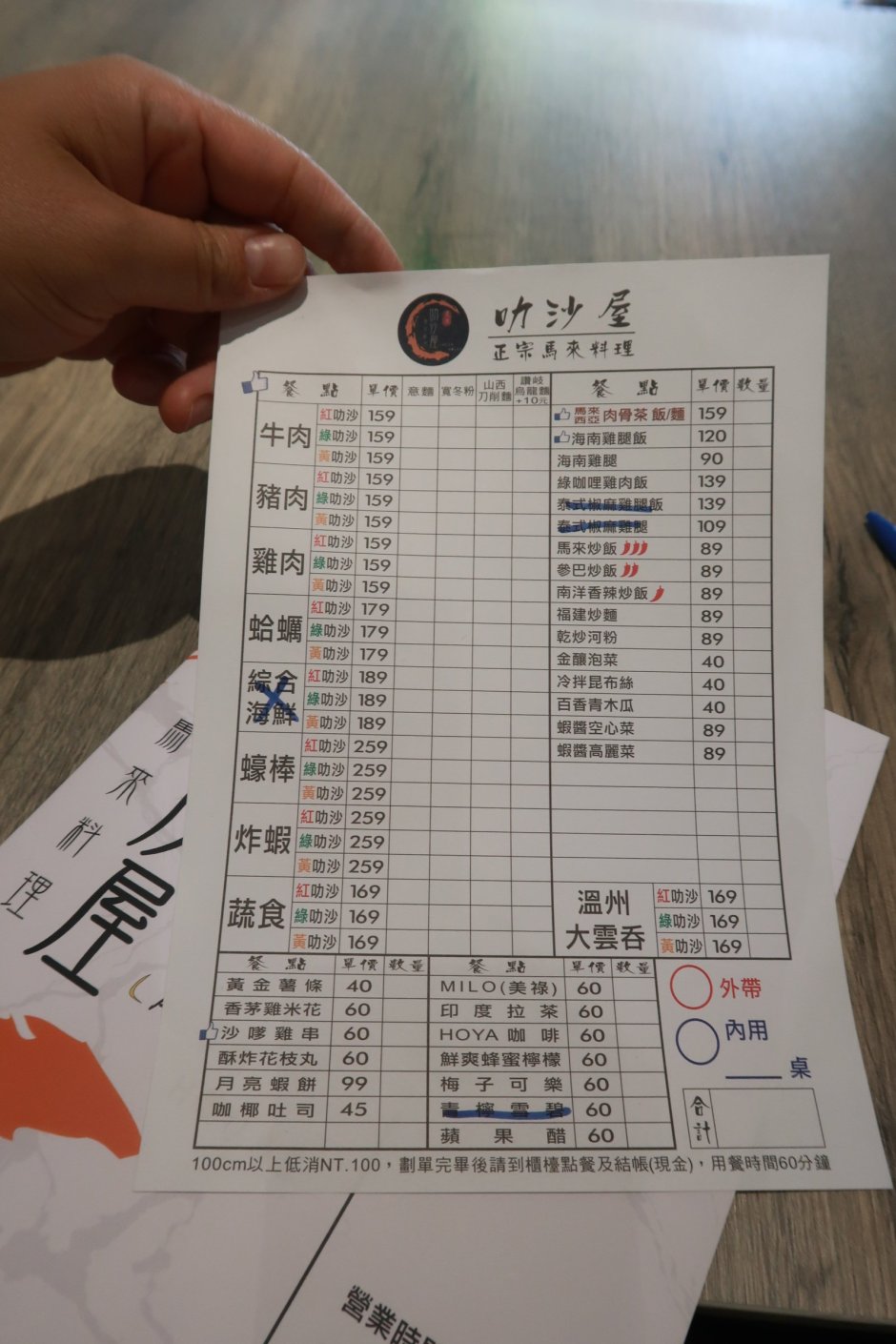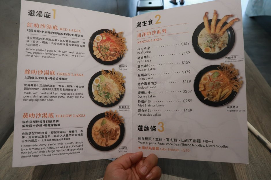 菜單解釋得很清楚,叻( ㄌㄜˋ)沙有分三種可以挑,紅、綠、黃。向來熱愛綠咖哩的我不意外地先嘗試綠叻沙!身為嘉義人理所當然要先吃家禽!( 嘉義的家禽都處理得很不錯,嘉義各地都有各自特色的火雞肉飯、民雄有鵝肉街、新港有生炒鴨肉…)