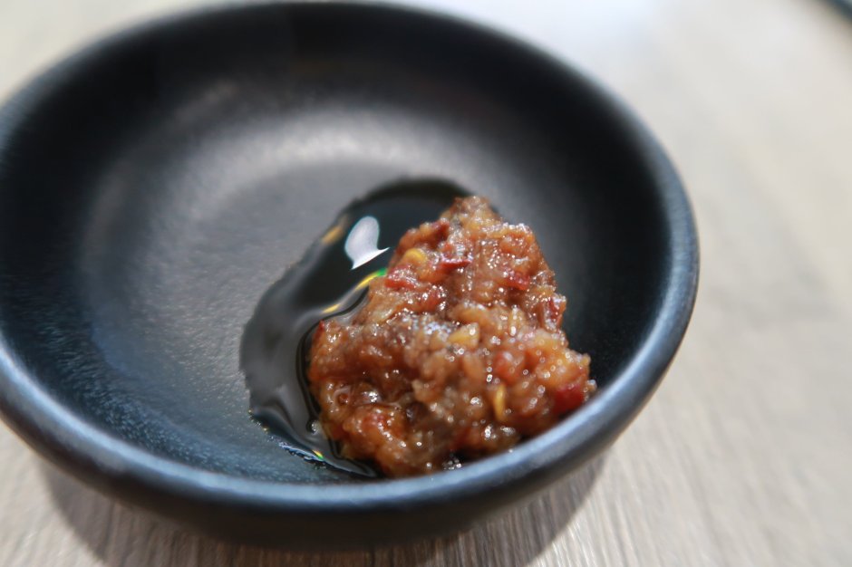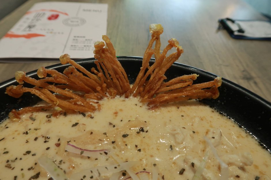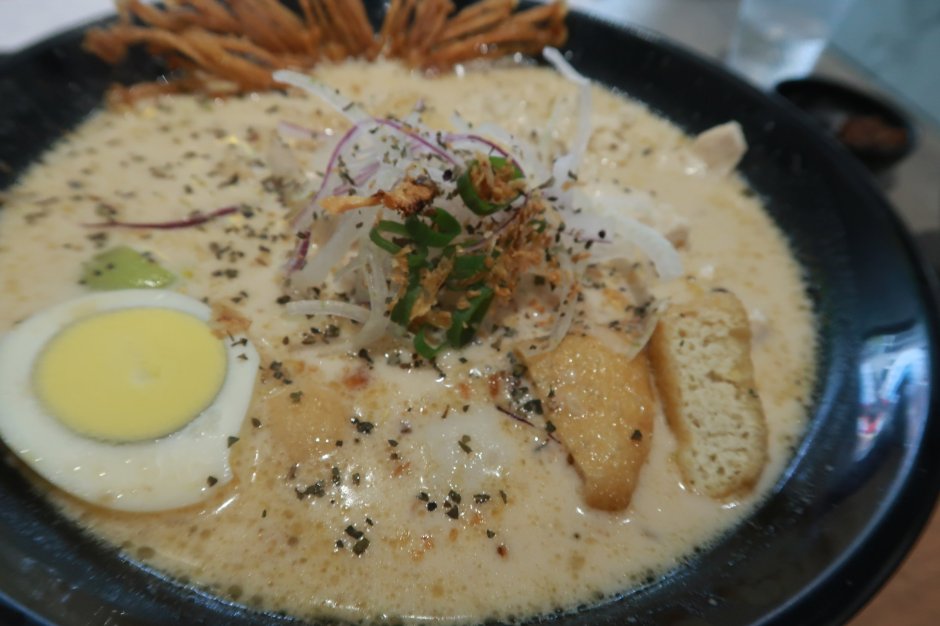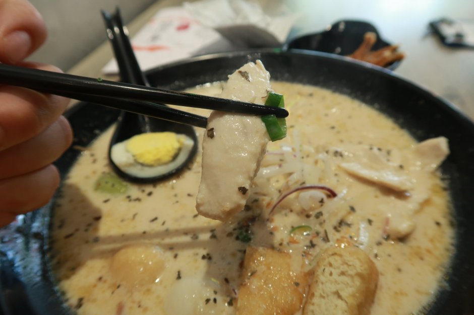 綠叻沙雞肉意麵:不得不承認炸金針菇的效果很好!非常吸睛也能帶來不同的口感,增加了不少酥脆度。綠叻沙的湯比我以為的還要清爽!算是濃郁風味裡面的清爽派,非常好入口的湯,值得稱許!我這次點意麵,意麵吸飽了湯汁相當入味,份量也很足。上面擺了很多豆芽菜跟生洋蔥片,搭配意麵一起吃,口感上面層次相當豐富,值得稱許!可惜的是旁邊為了增加份量而放的配料,像是三角豆腐、丸子跟水煮蛋都很突兀,沒有整體感。最令我失望的是雞肉!他就是我一般來講最討厭吃的那種水煮雞肉,沒有調味、沒有醃漬,更沒有舒肥過。就只是煮好放涼,出餐之前放進碗裡面而已,超級突兀的!簡單來說就是雞肉還好。