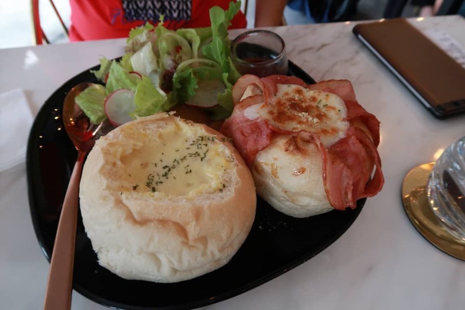 黃色德國人 / 咖哩德腸帕尼盅 ( 焗烤 ):這個是我表妹點的,雖然焗烤的理論上會比較晚上桌,但是也沒有晚多久。算是速度很快的!麵包量很大的一份!我有吃了一口焗烤的那份主餐,不予置評。