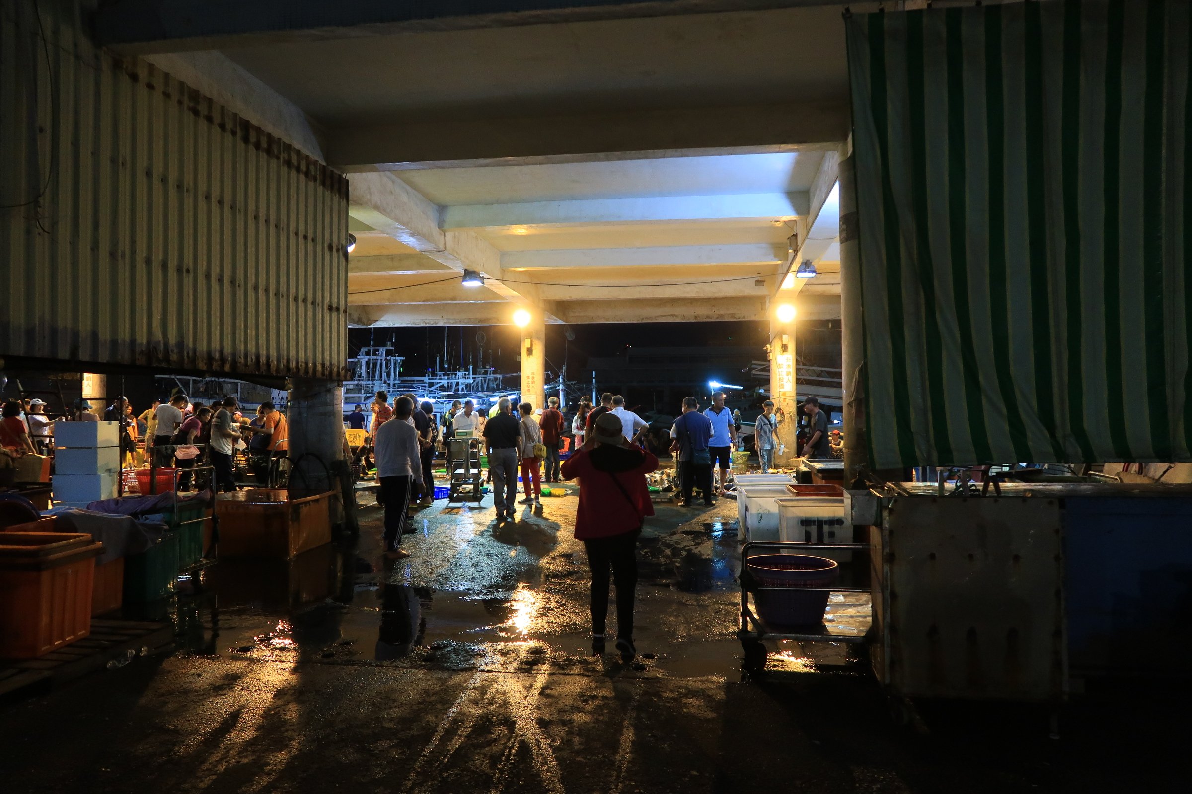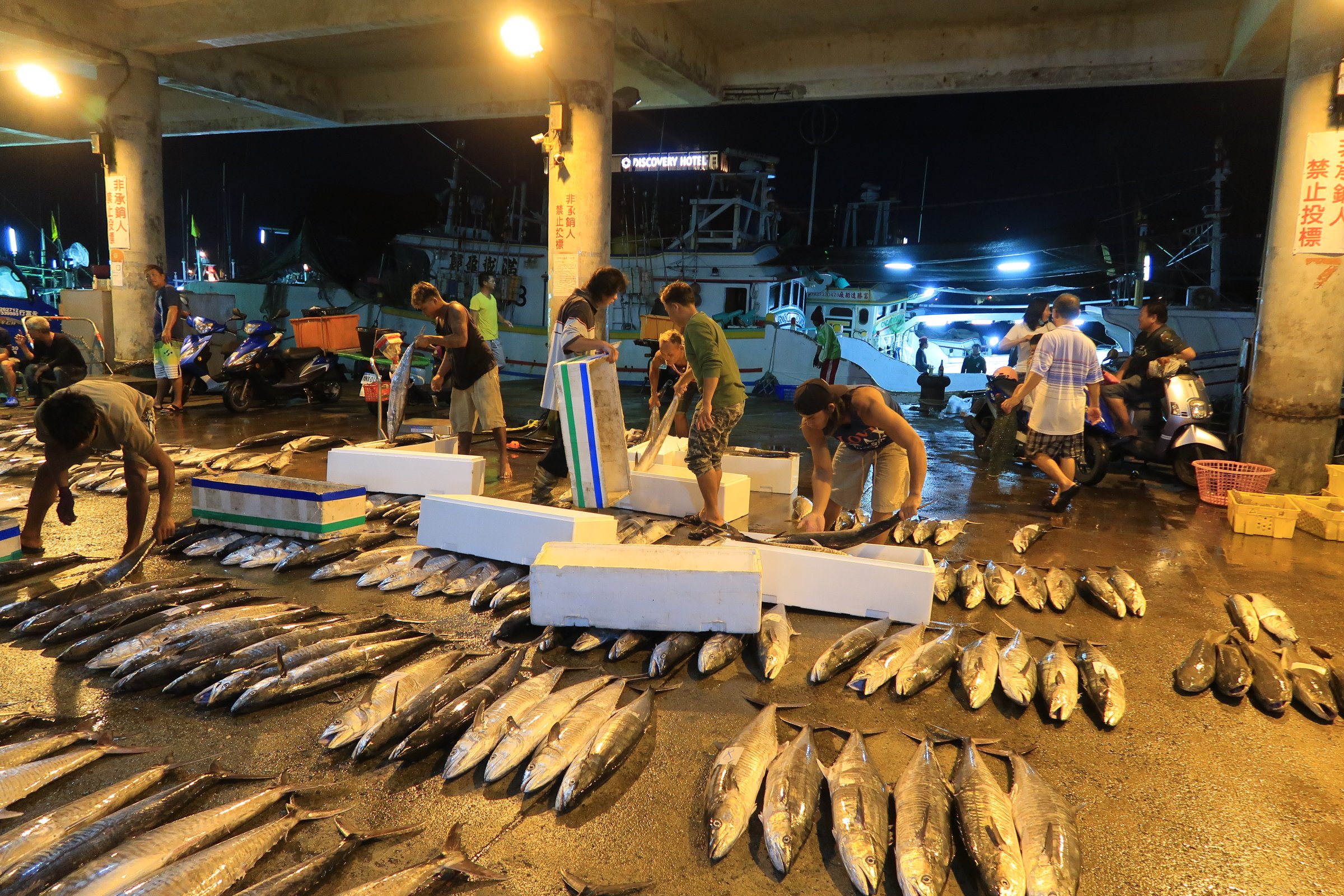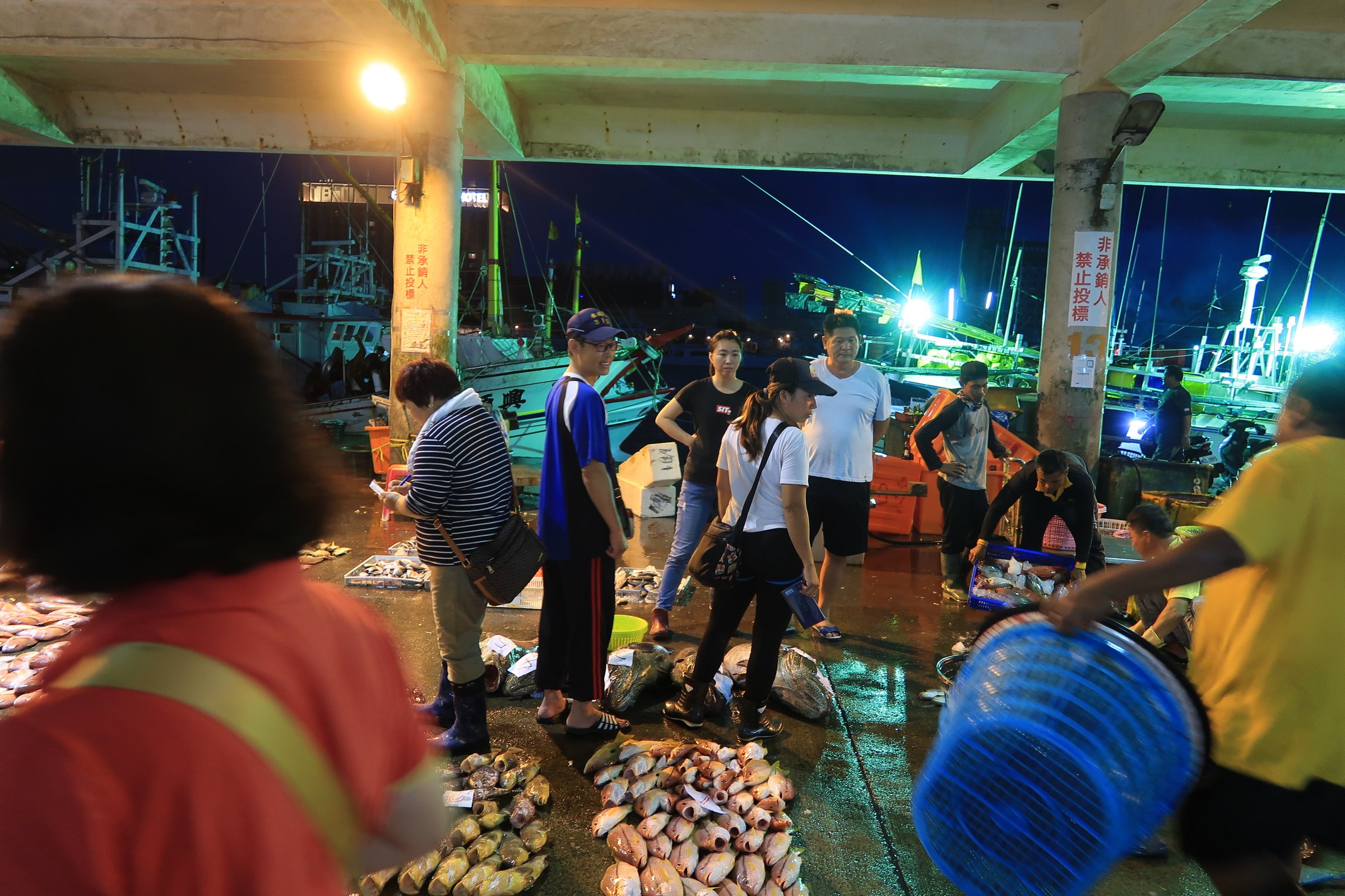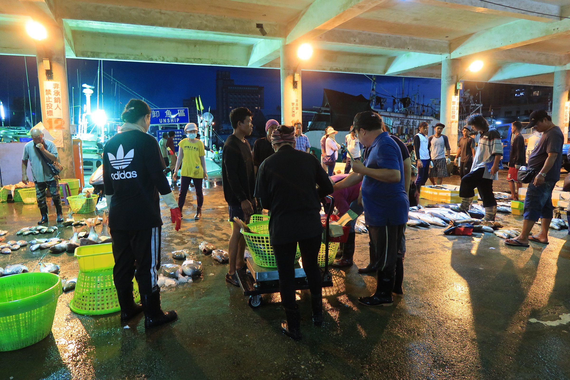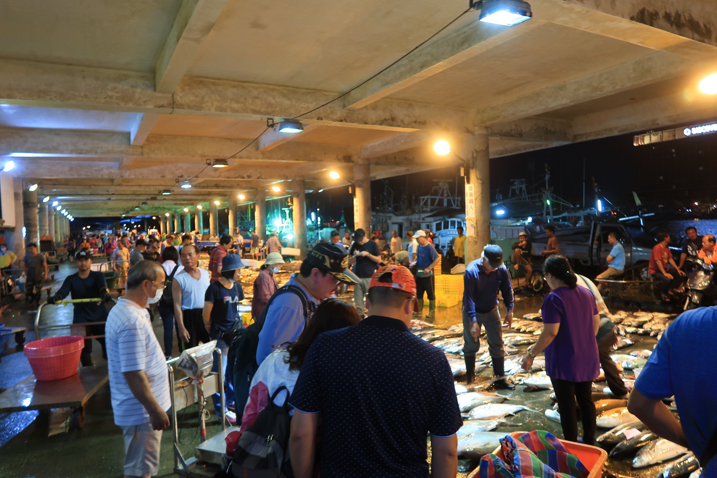 魚市場中央還是一片漆黑,跟著人走,才發現右手邊的港邊,才是漁船進貨販賣,大盤商的天下!