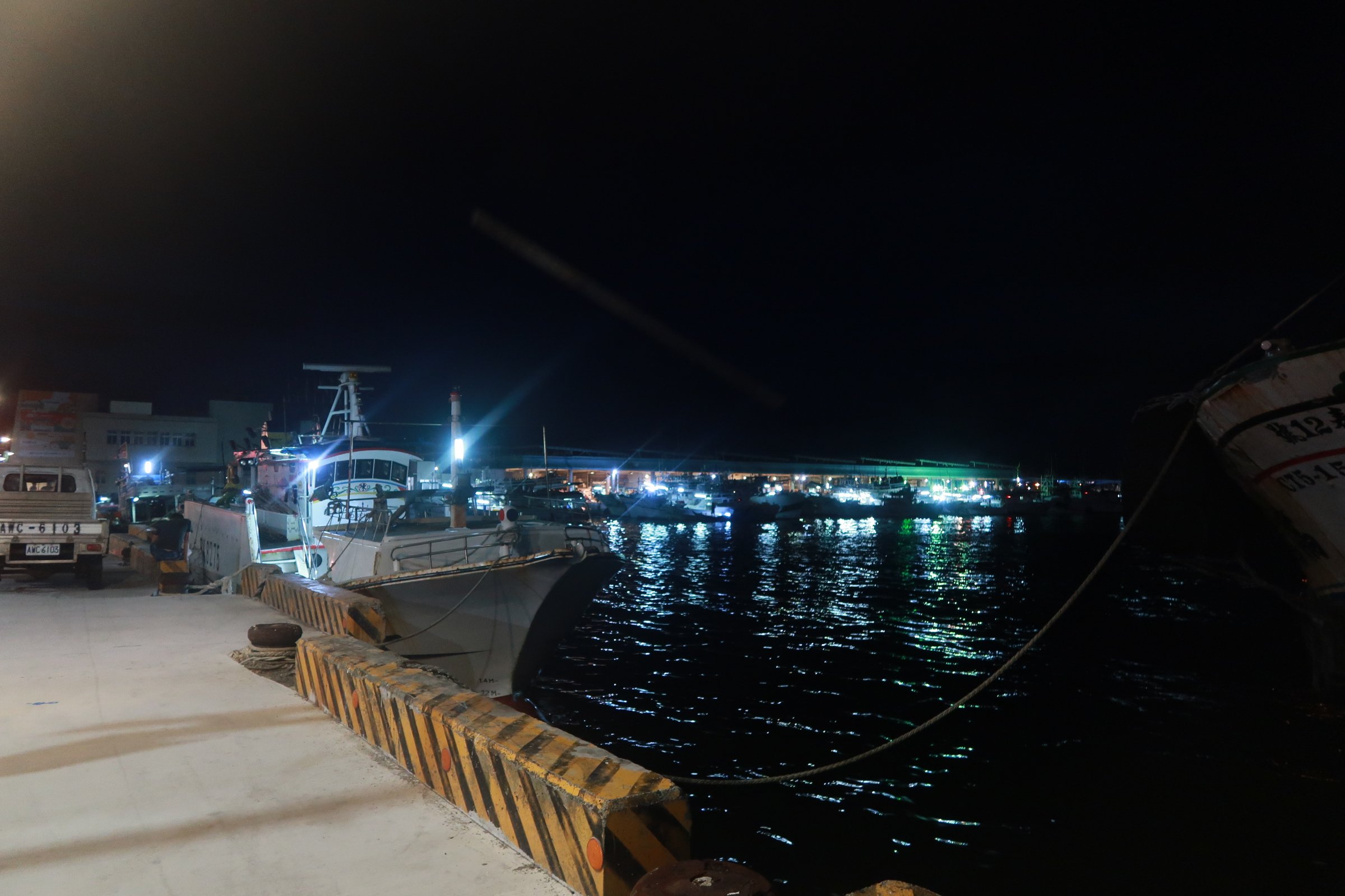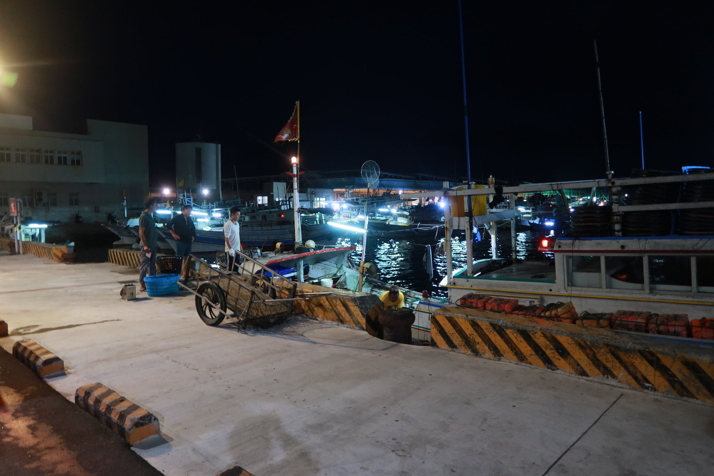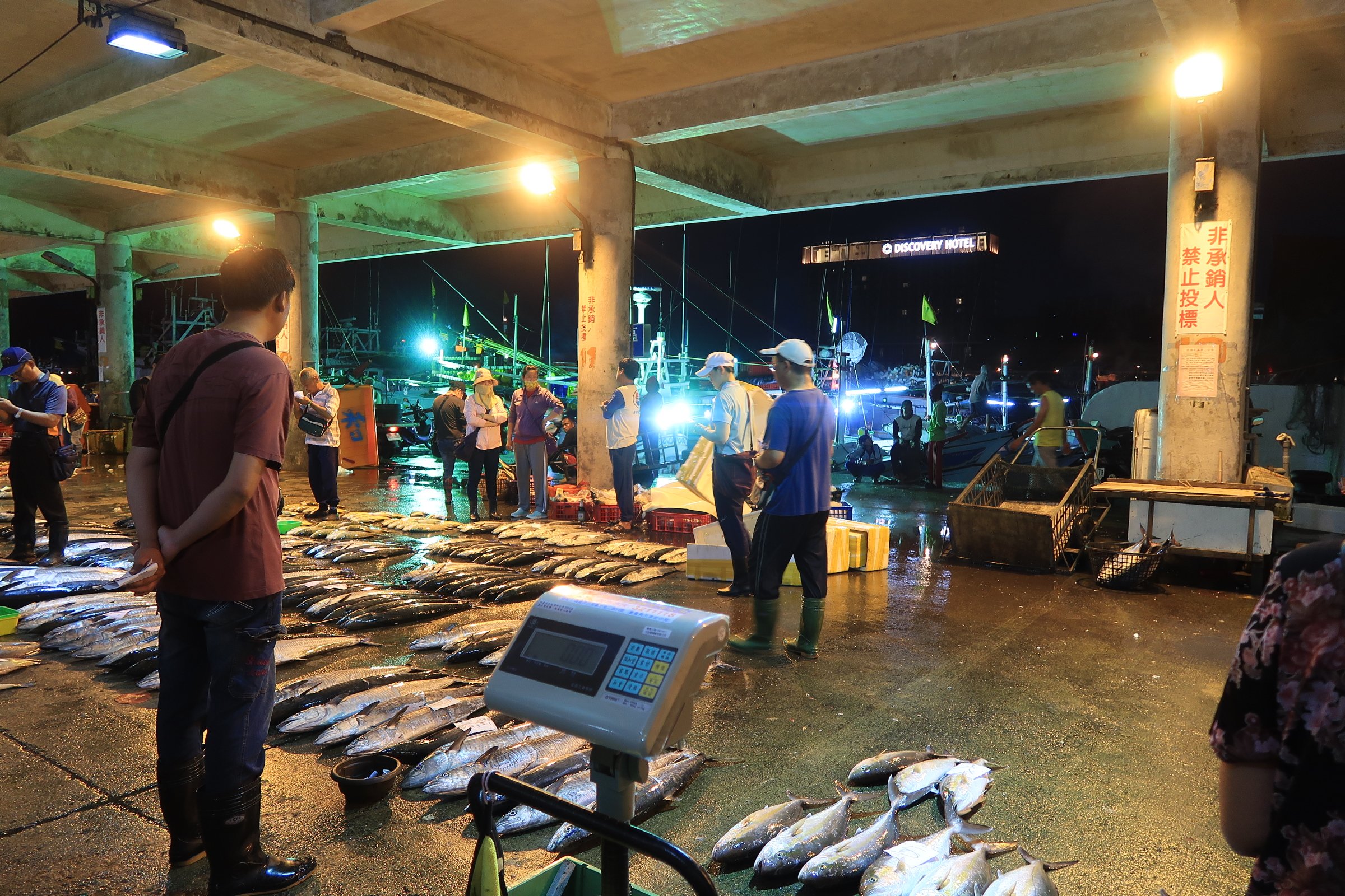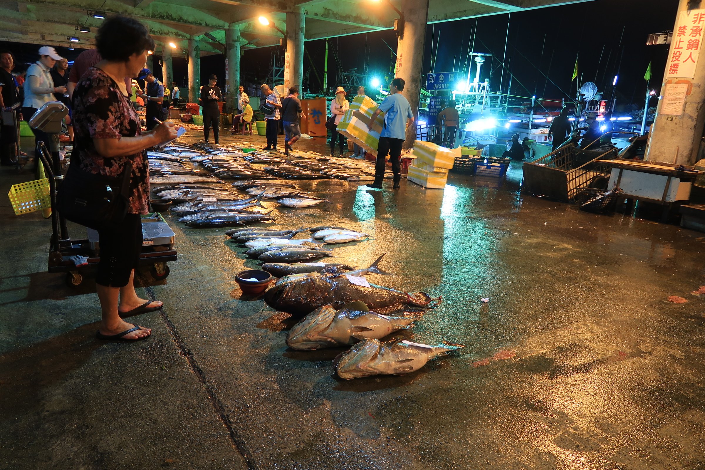 魚市場中央還是一片漆黑,跟著人走,才發現右手邊的港邊,才是漁船進貨販賣,大盤商的天下!
