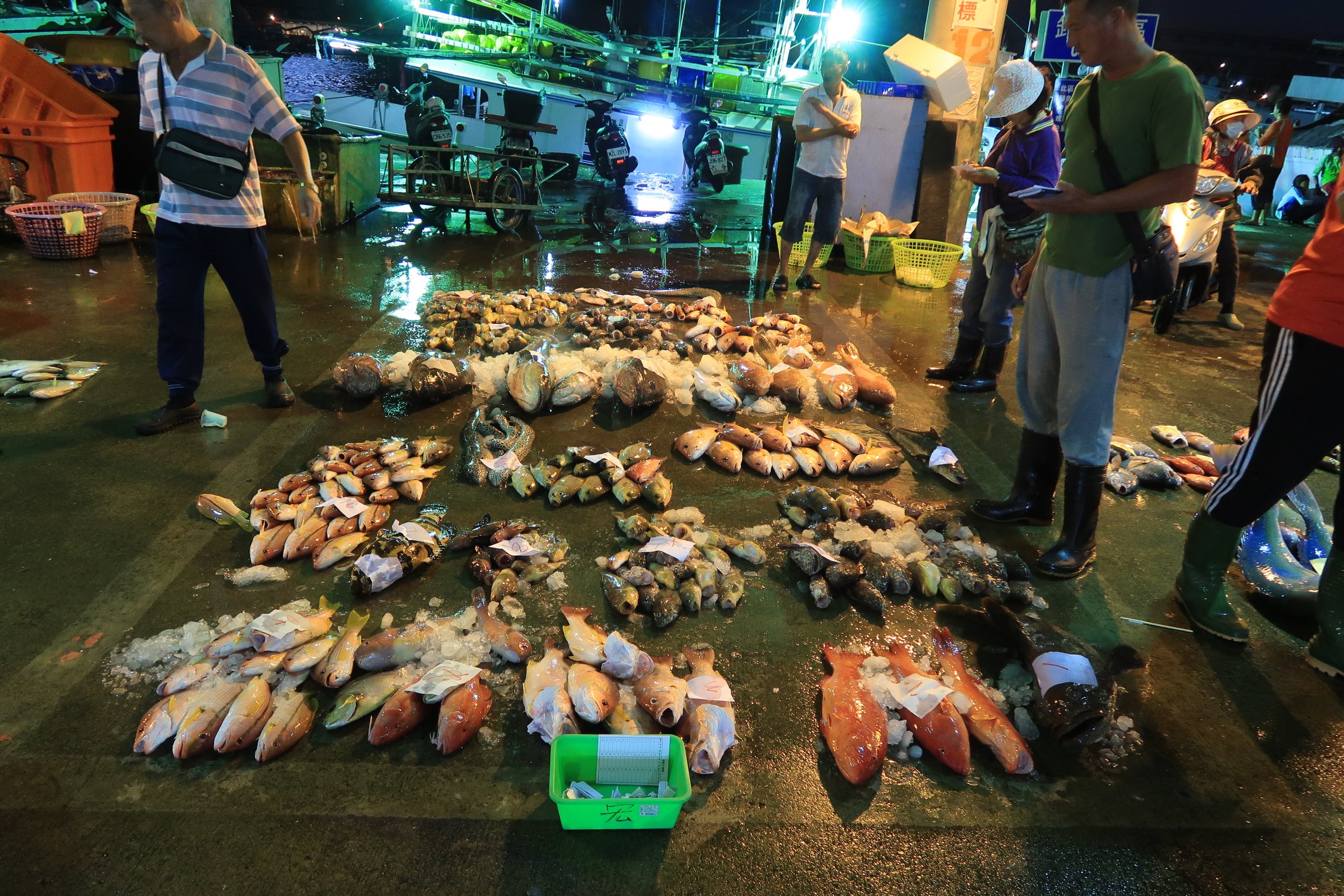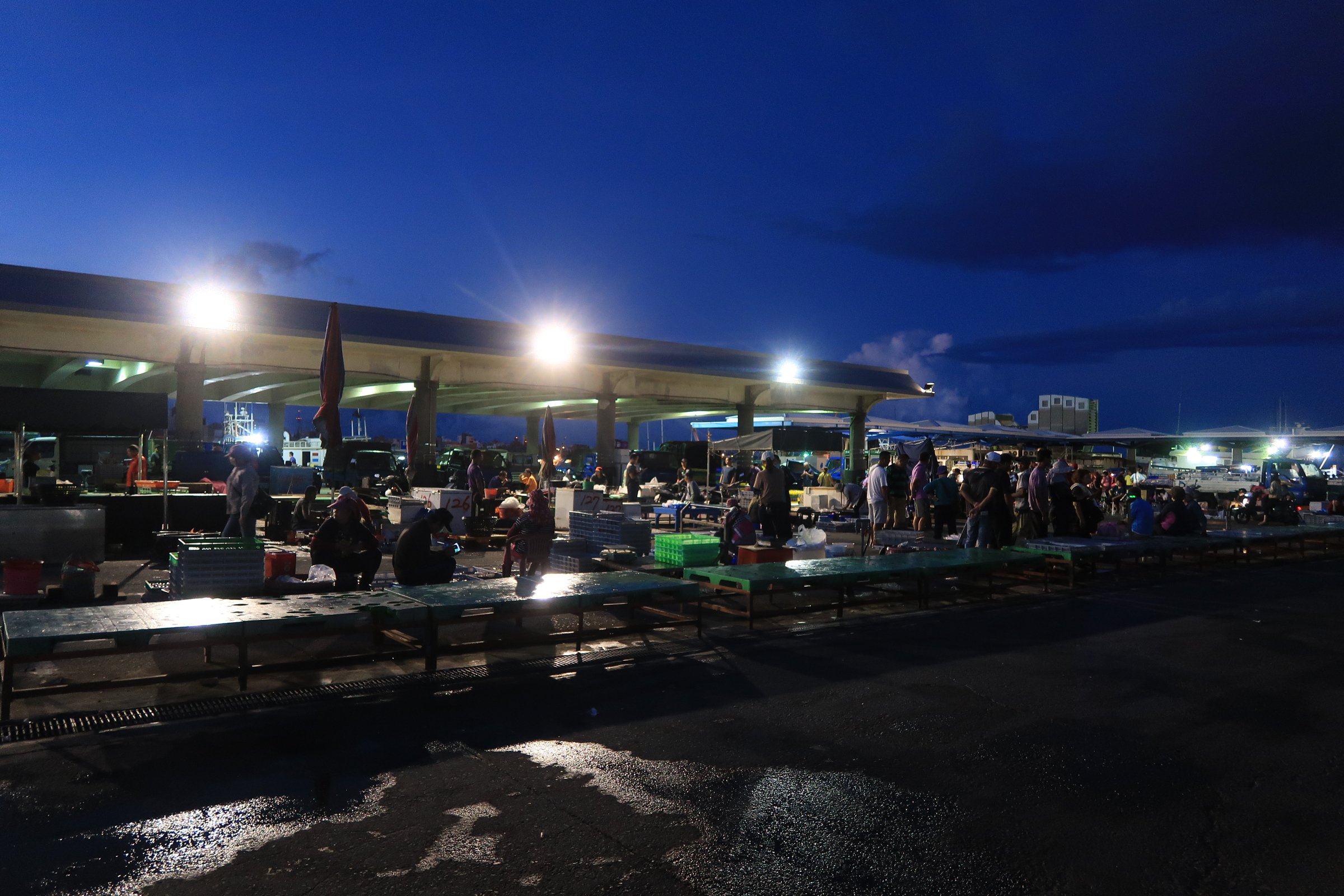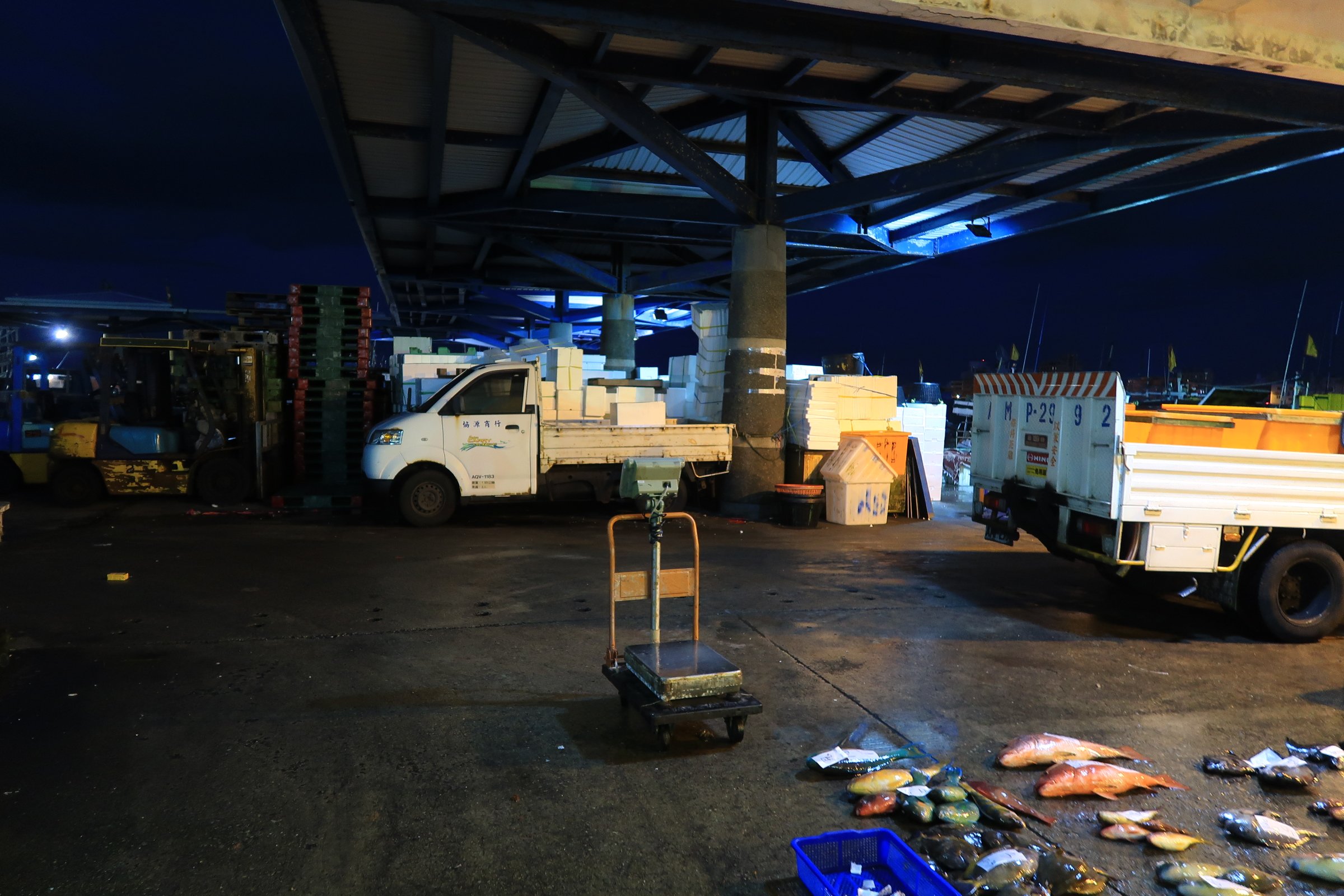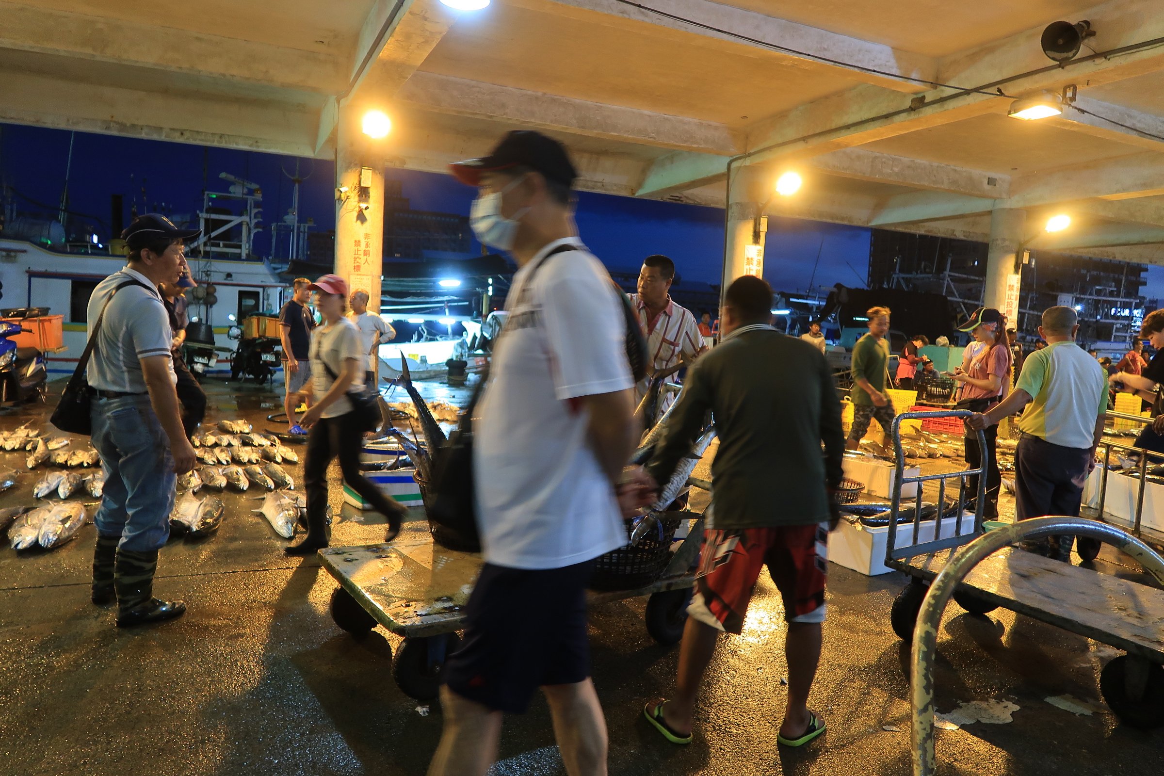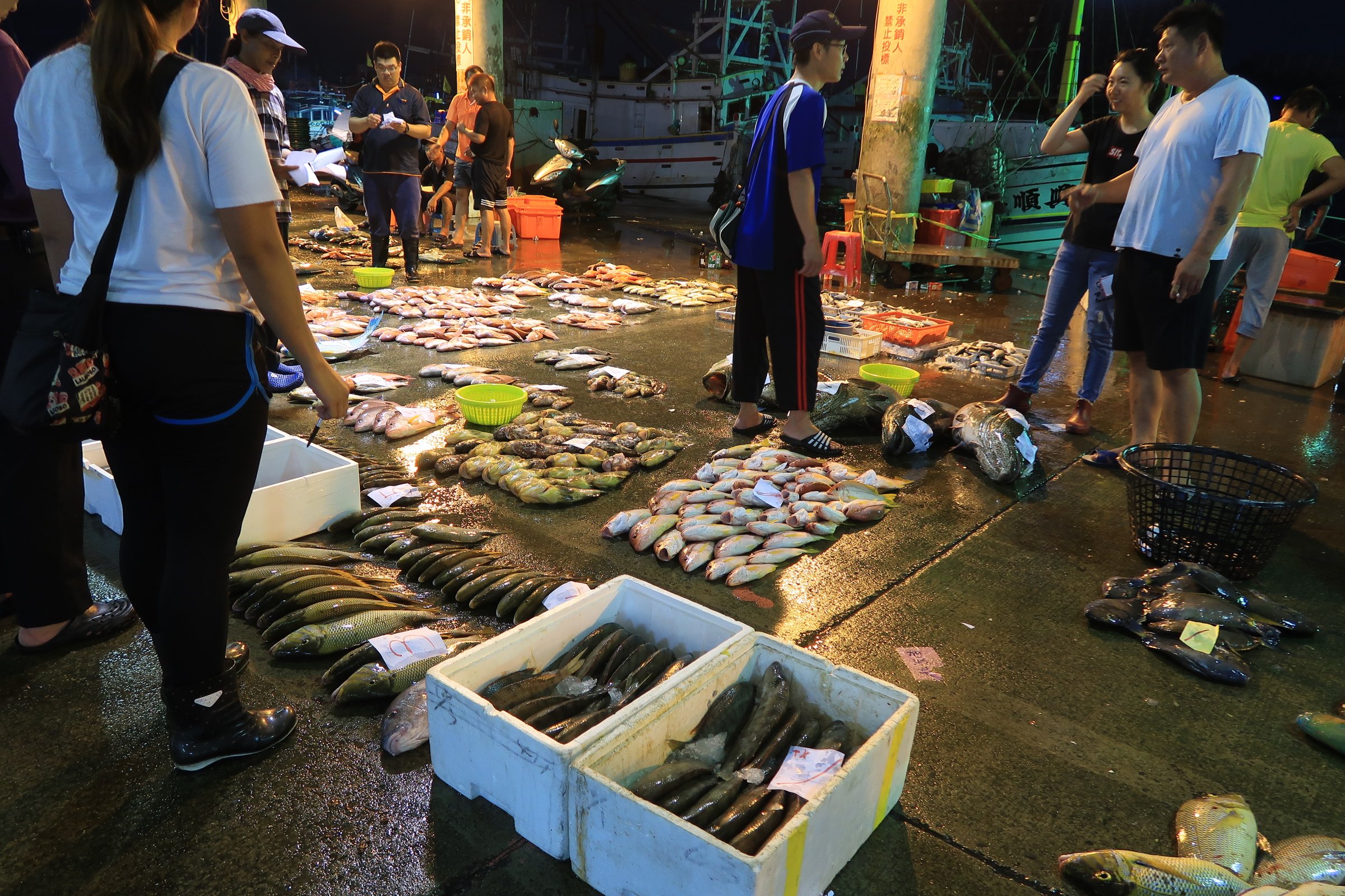 魚市場中央還是一片漆黑,跟著人走,才發現右手邊的港邊,才是漁船進貨販賣,大盤商的天下!