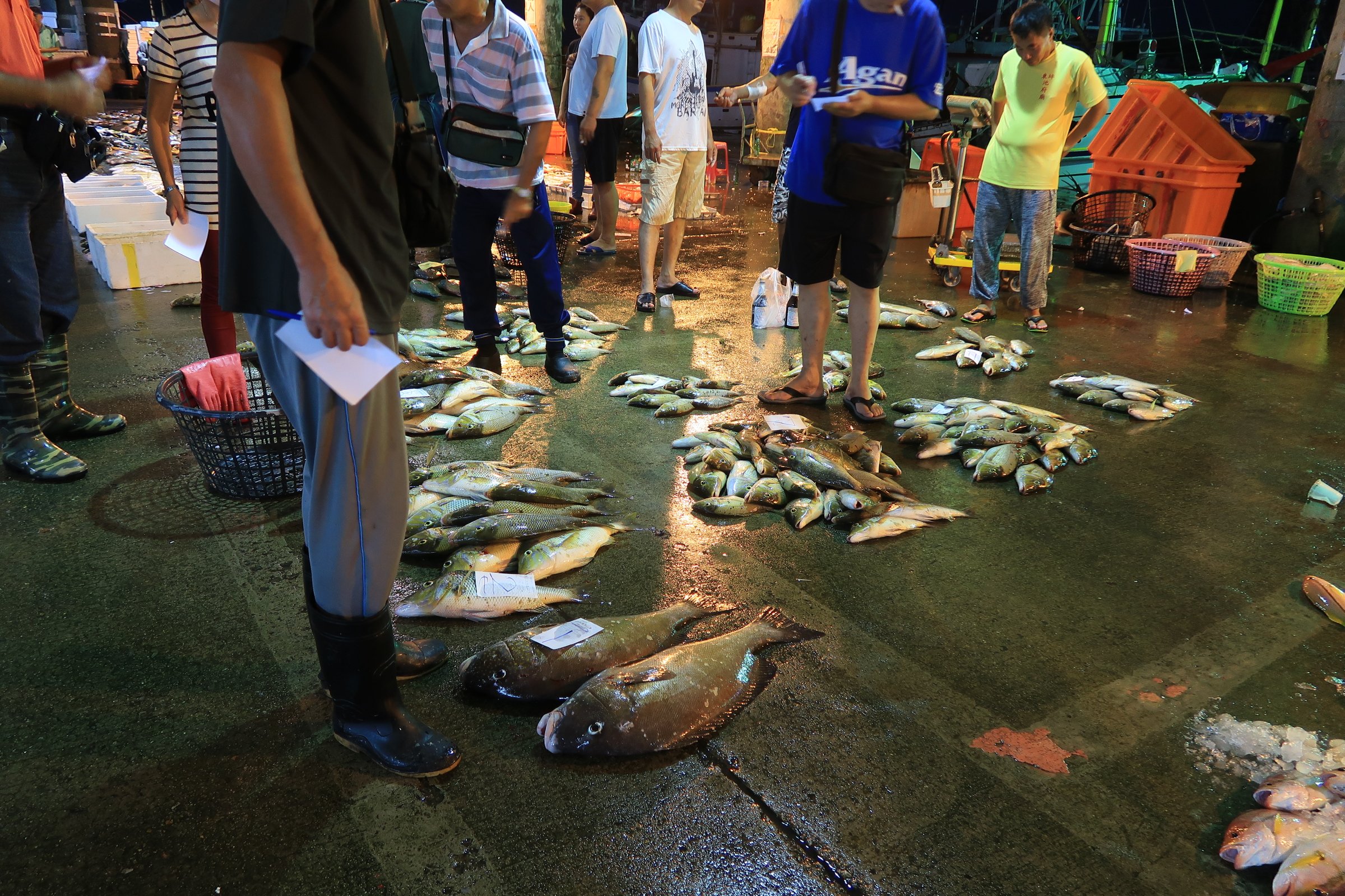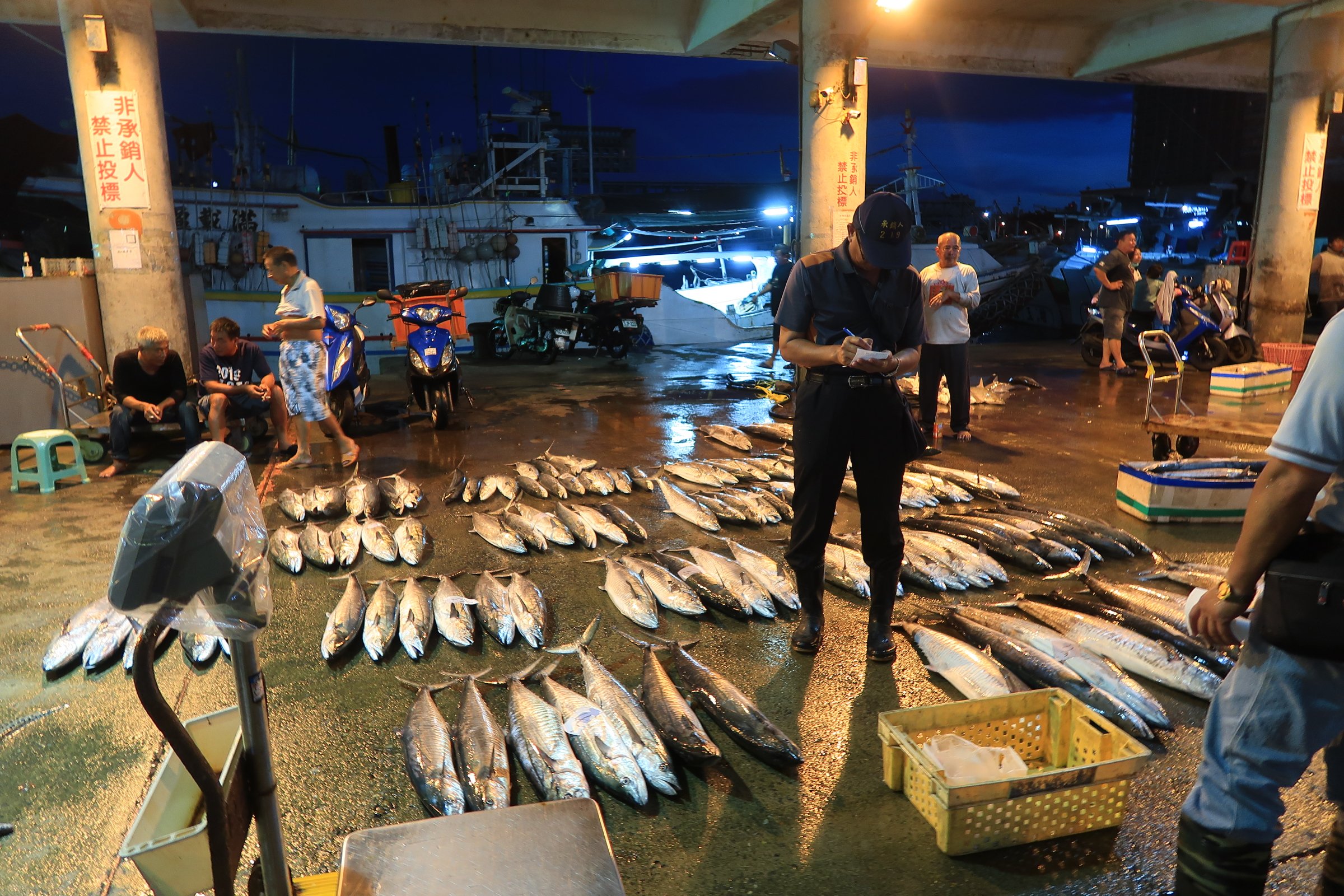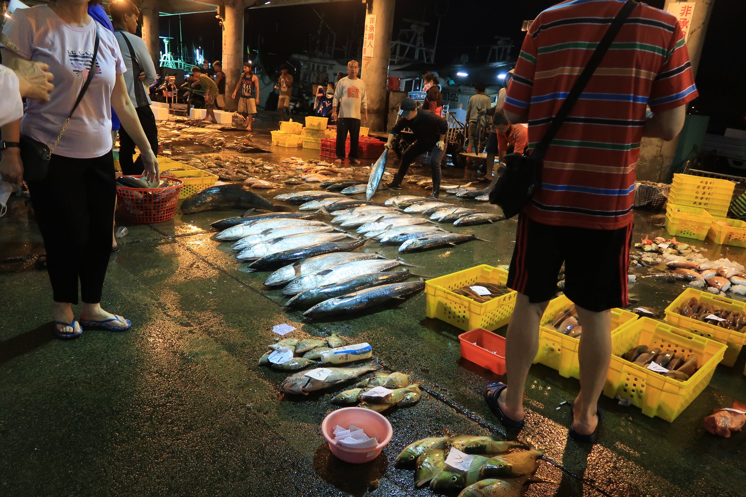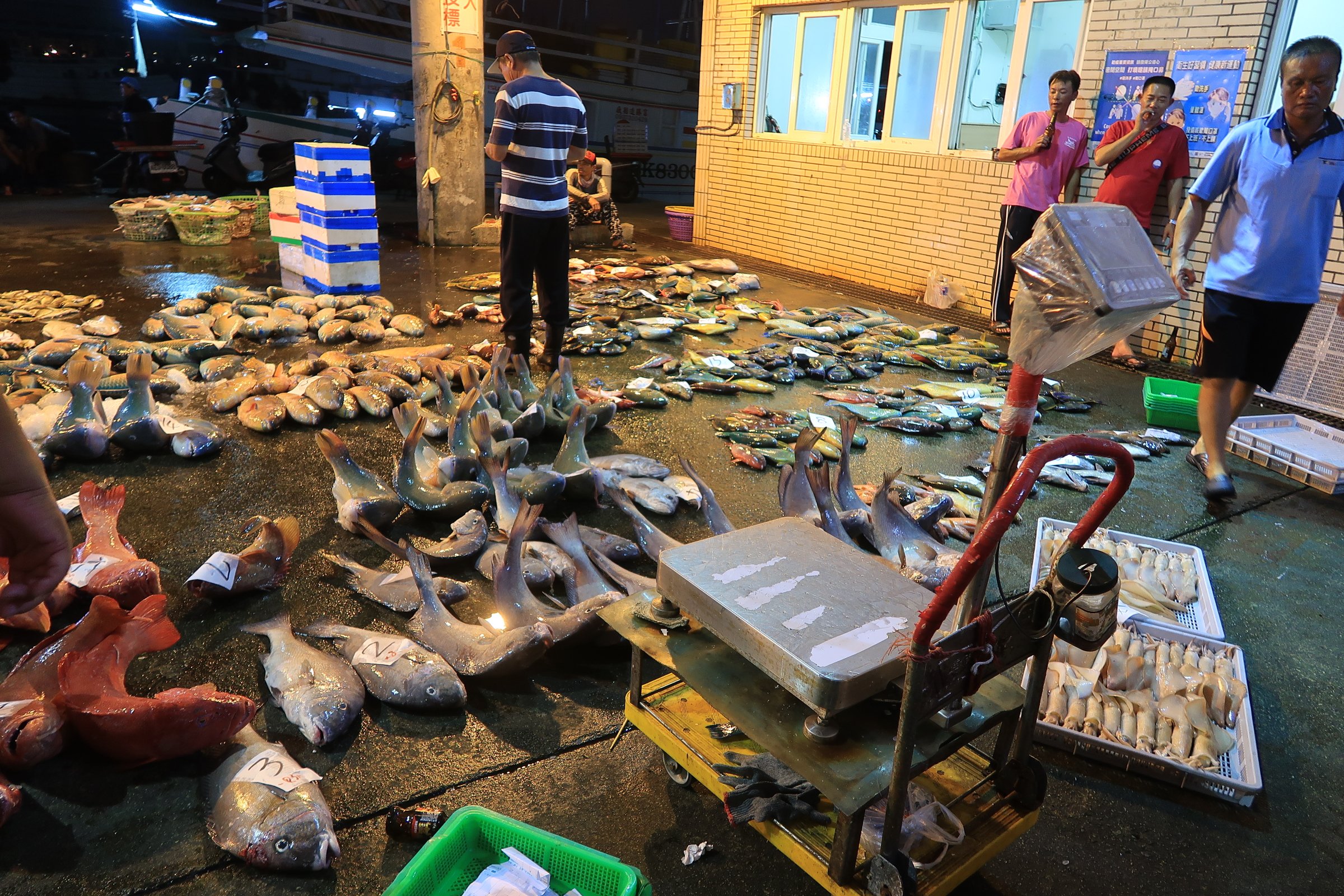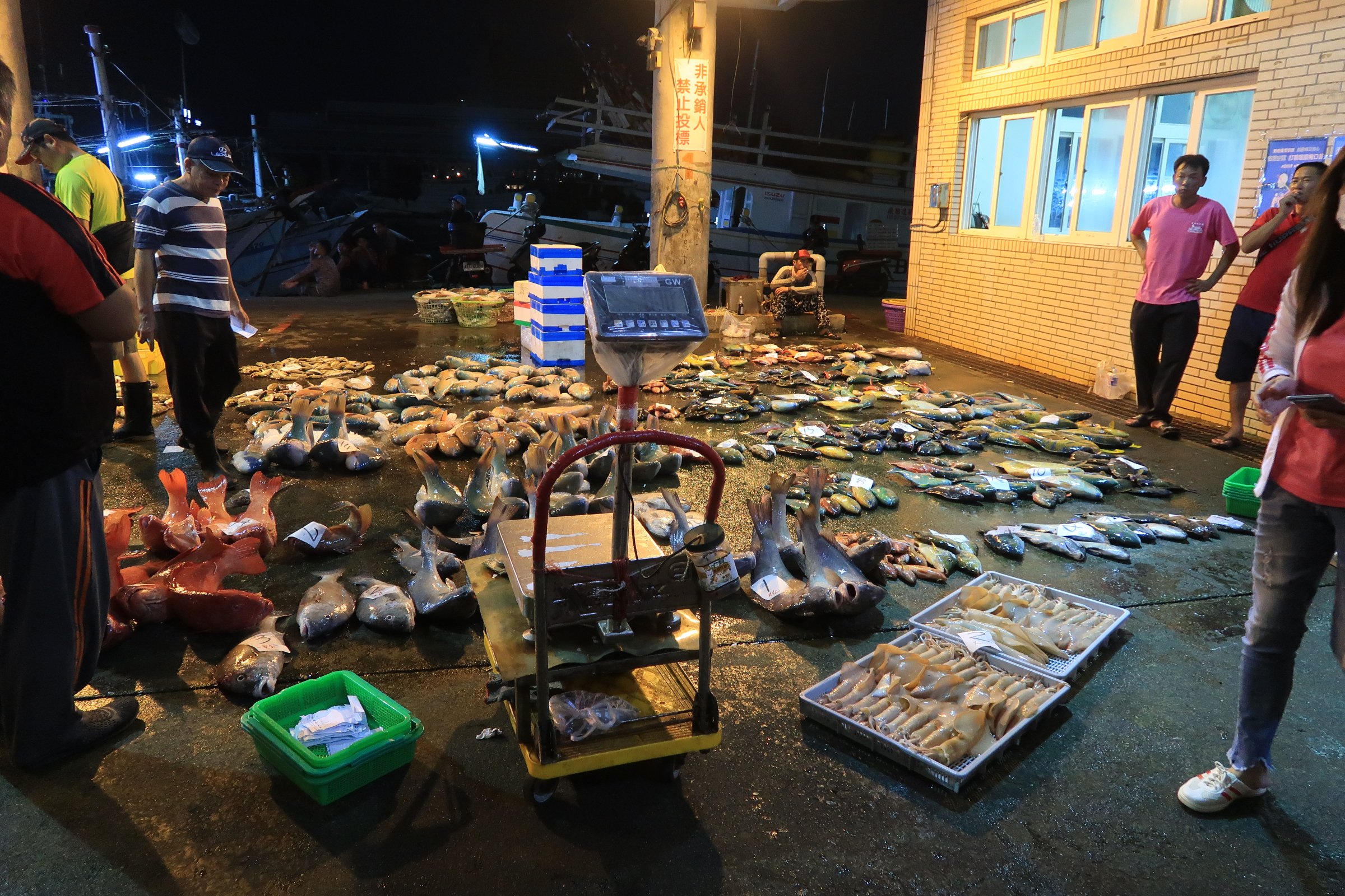 幸好走超過一半,觀光客就變少了,我就更專心的看魚,還有偷拍大戶跟漁民喊號碼、稱重、把貨帶走……。