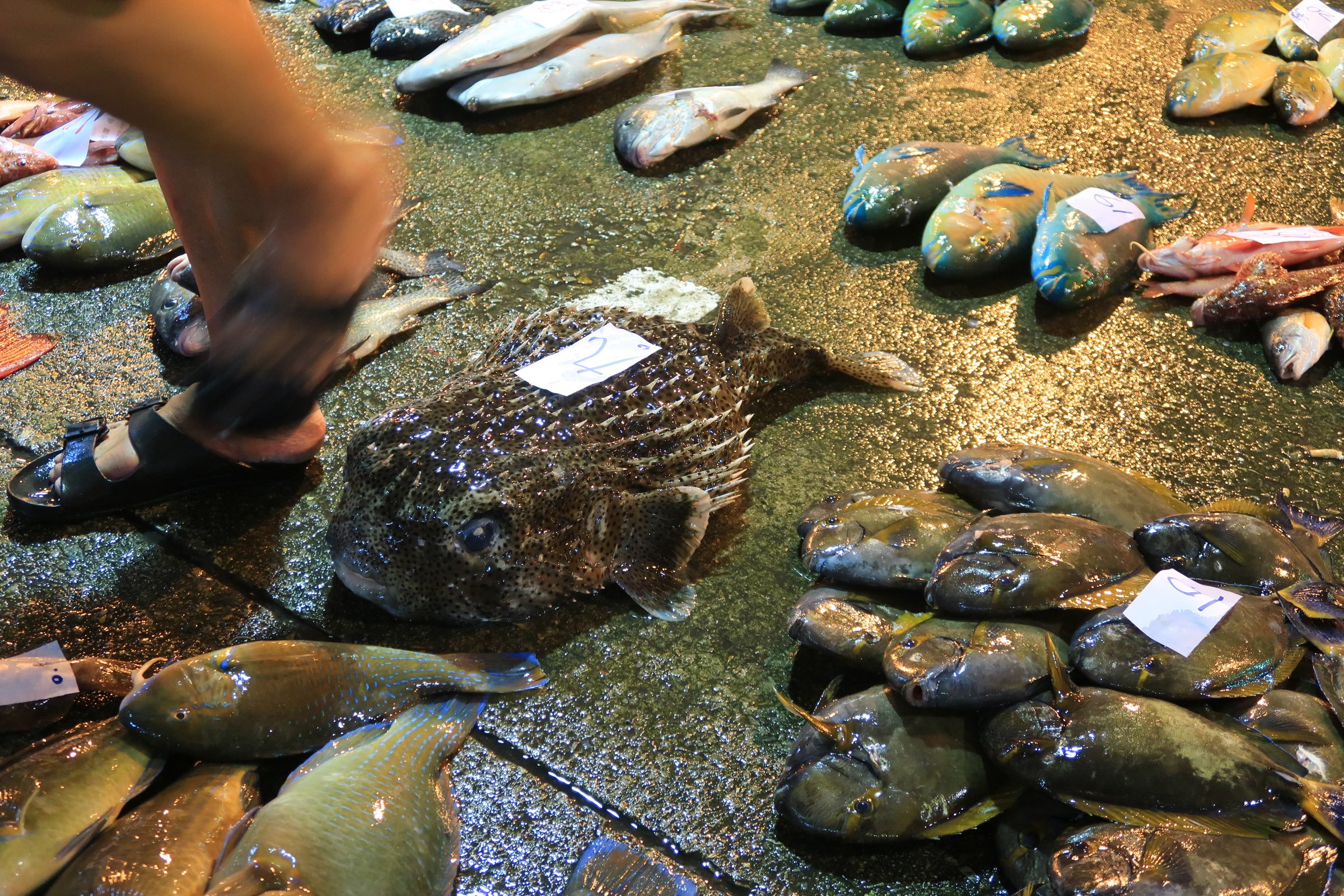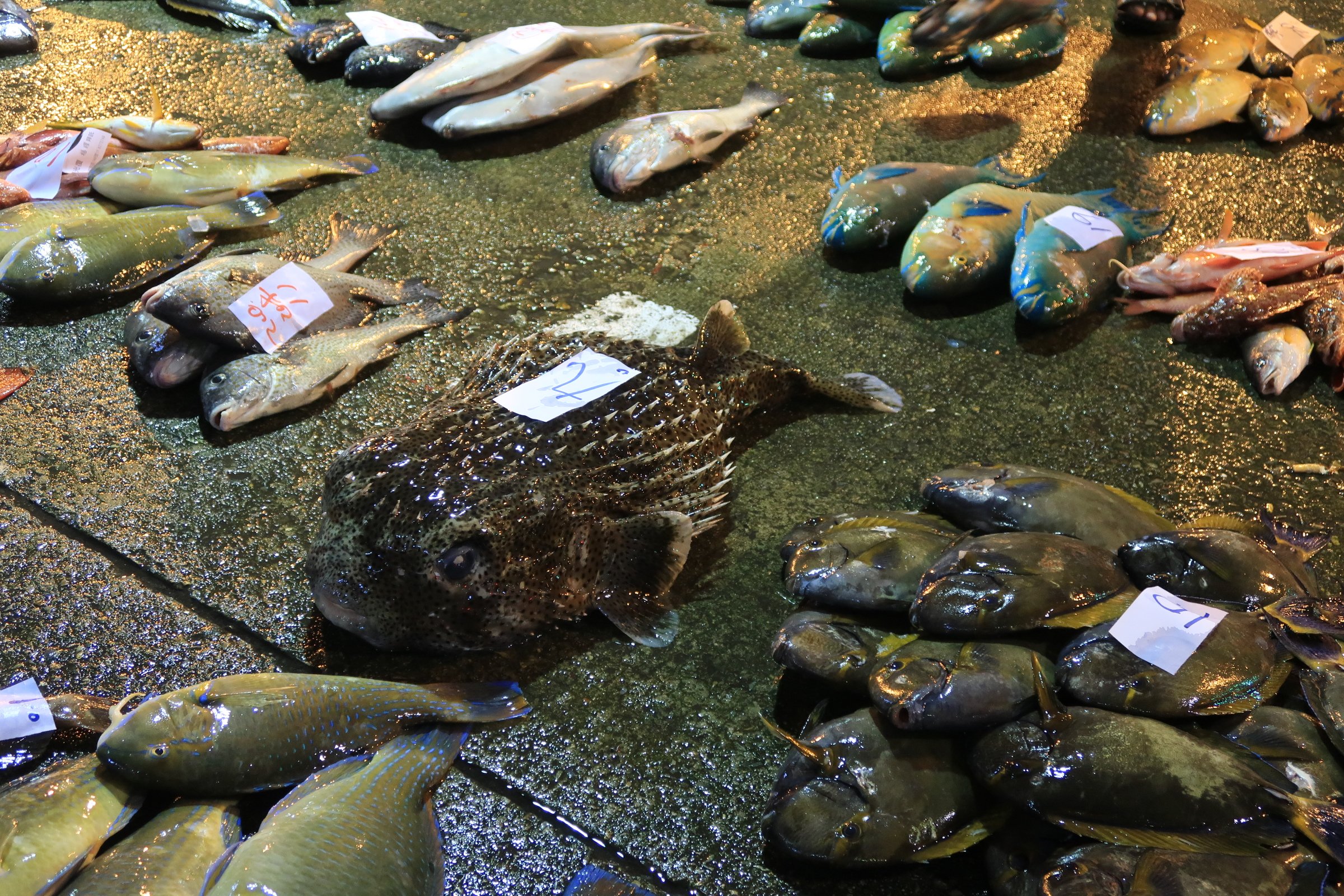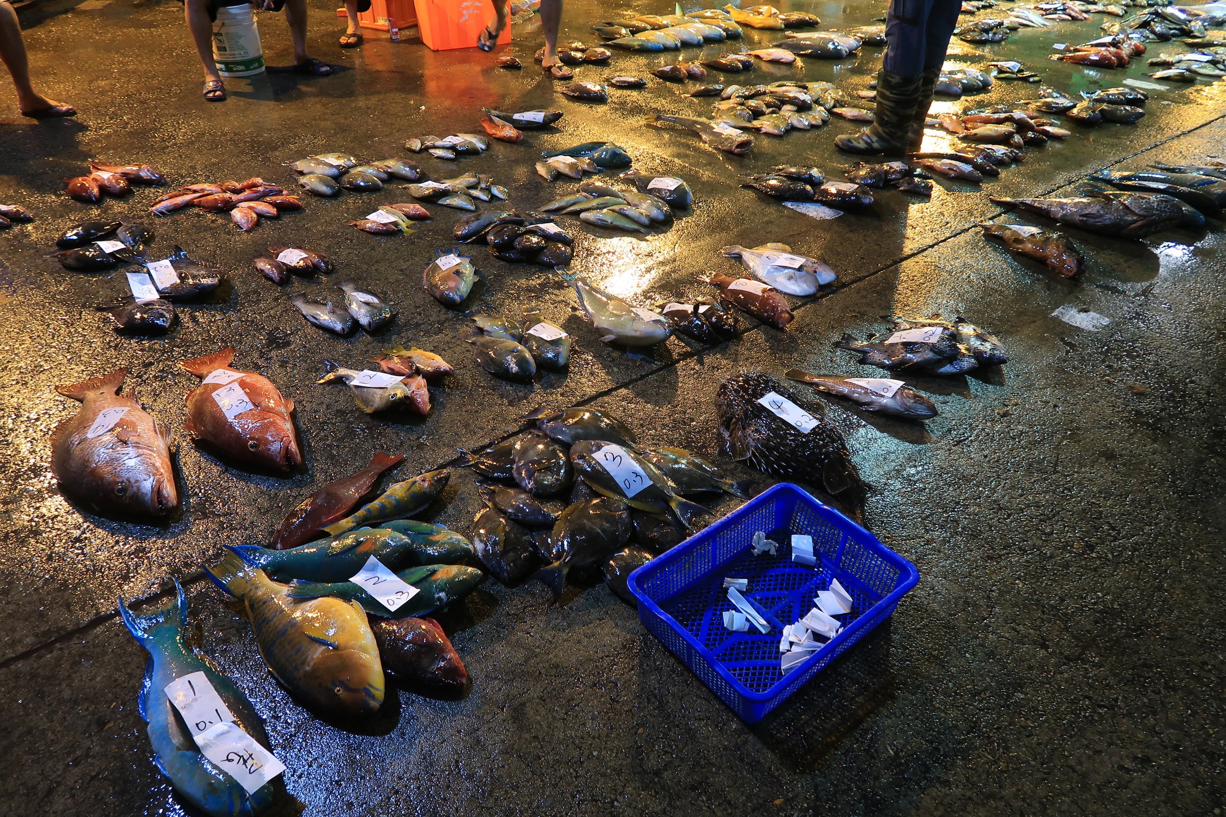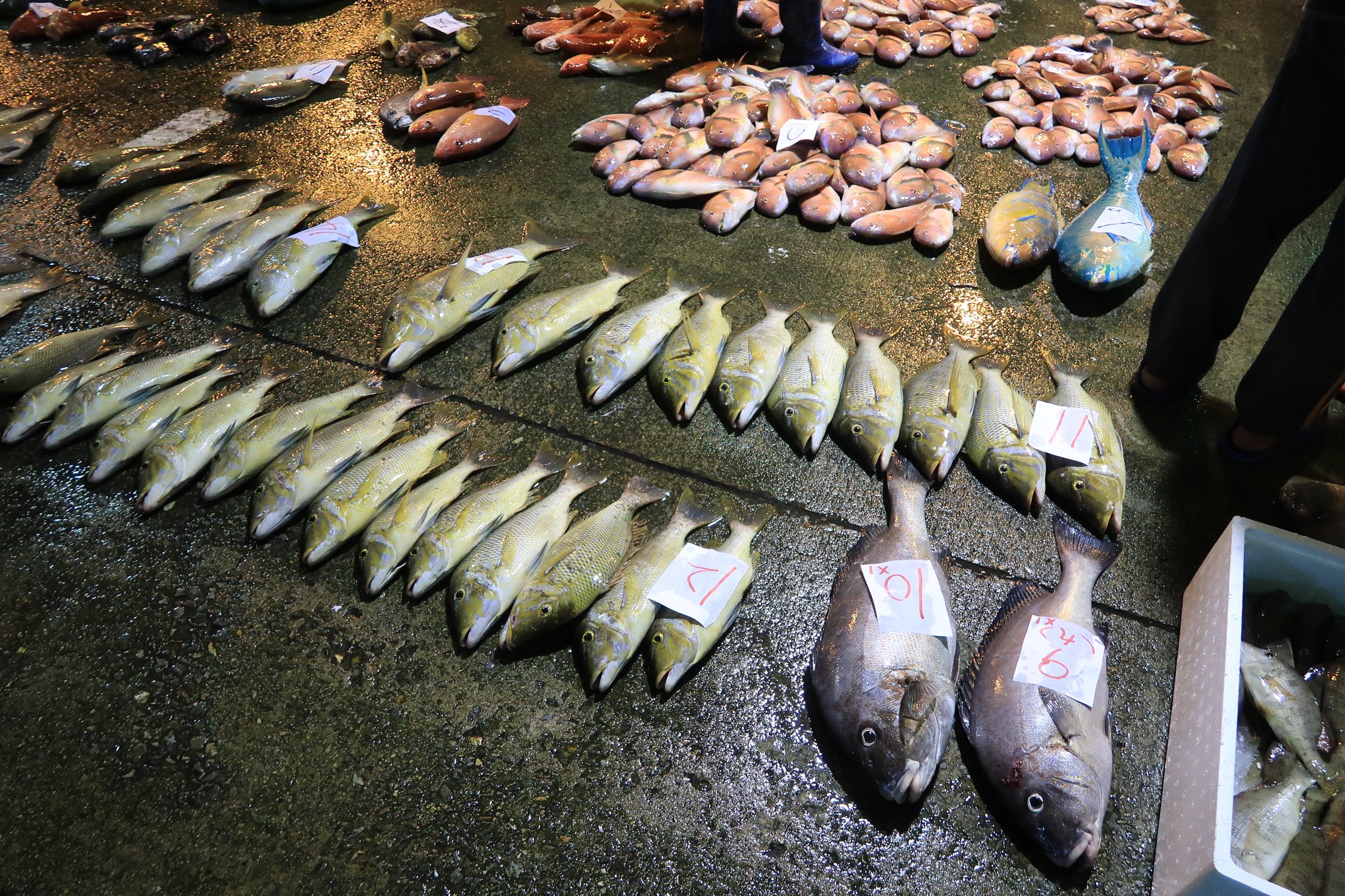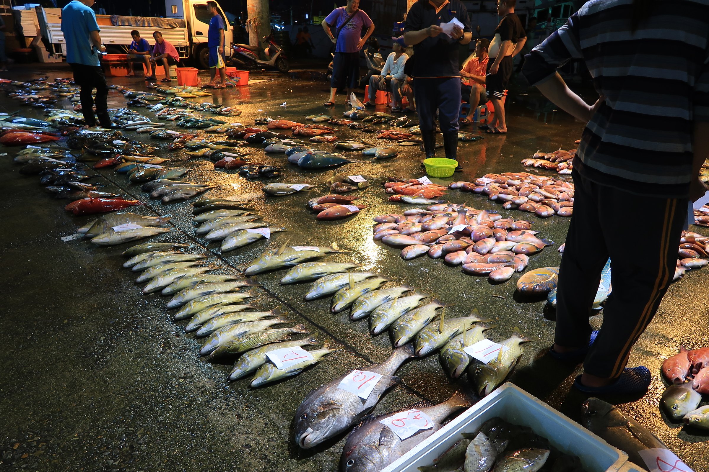 幸好走超過一半,觀光客就變少了,我就更專心的看魚,還有偷拍大戶跟漁民喊號碼、稱重、把貨帶走……。