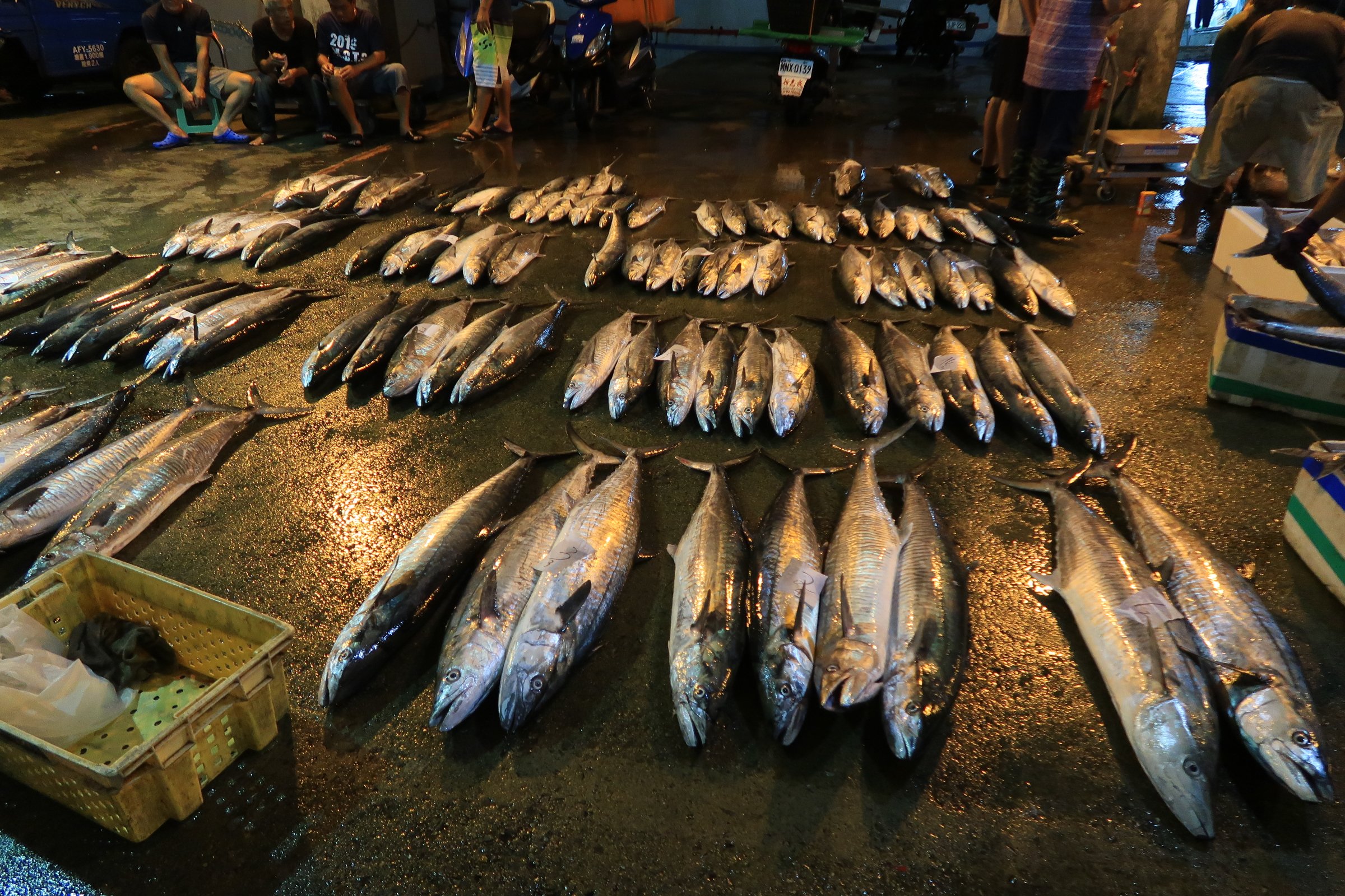 因為住得近,所以硬是睡到4:30才起床,本來還怕會不會太晚去,到現場也是還好。就沒拍到漁獲入場的鏡頭,但是滿地的大魚,看起來就像一場派對!