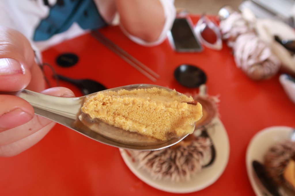 可能我們看起來太不像老饕,面對直接上桌的海膽,表情遲疑的太明顯。老闆娘姊妹立刻過來介紹要怎麼吃,還直接挖好在湯匙上直接給我們!(⑉⊙ȏ⊙)服務這麼好,真的可以嗎?