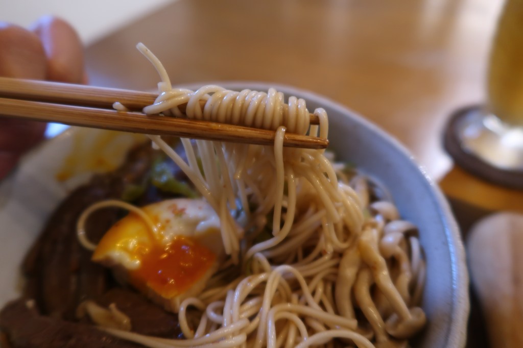 可見筷子的品質真的很好XXD 牛腱肉厚薄適中又極軟,一入口那秒立刻晉升我心目中牛腱前三名。(註一) - 乾拌麵:細麵上均勻裹了醬料,入口有嚼勁。微甜鹹香的涮嘴醬味,讓我頓時記起這家店是台南風格。