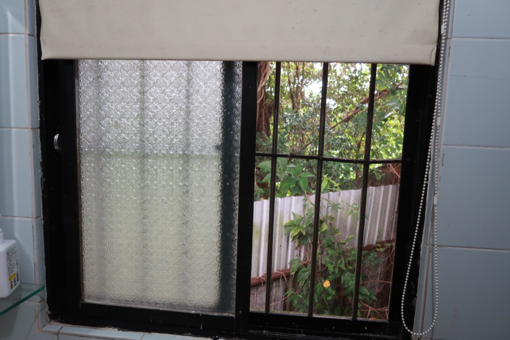 是說這個浴廁也有兩個窗戶,一個是面對另一棟屋頂陽台,已經用鐵門完全封死。另一個對外窗面對的是自來水園區的後山,白天風景很好,晚上有點可怕。