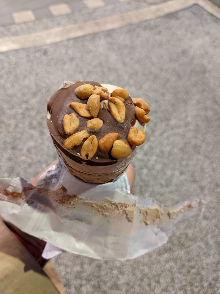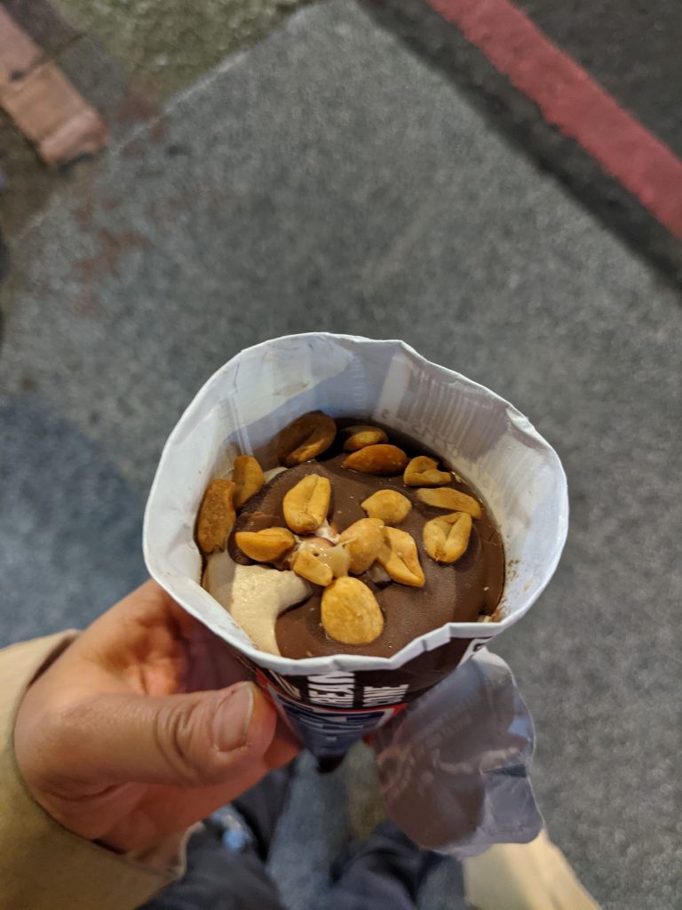 冰淇淋本體是順口的,跟一般我吃士力架時感受到的濃厚感有差距。我想如果是平常熱愛吃士力架的人,可能會吃不慣吧!但就我這種一般嘗鮮的消費者來說,覺得整體味道平衡得很好,個人滿喜歡的。
