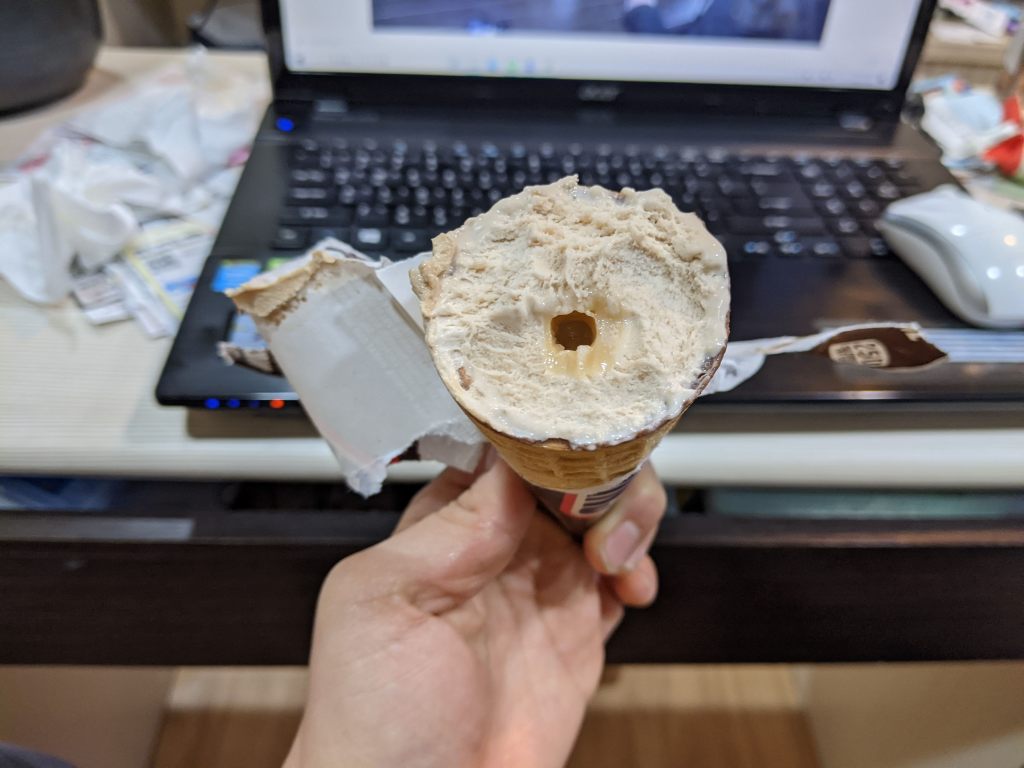 把上面那層吃掉,吃到跟餅乾一樣高的時候,冰淇淋中間就會出現一個洞。