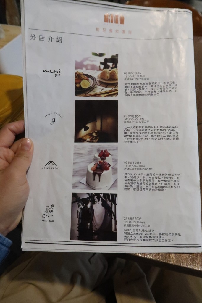*他們自己菜單最後面會介紹其他分店。根據去查這個餐飲集團,他們四家店的順序是Merci Petit → Merci Café → Merci Vielle → Merci Créme *