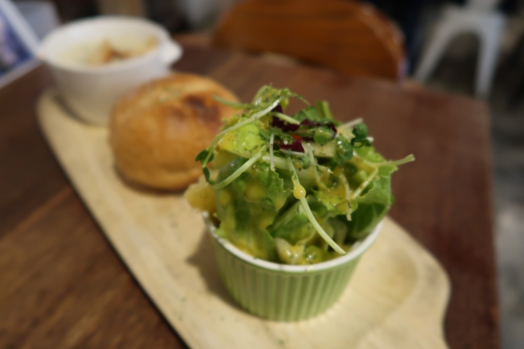 沉浸在麵包美味中的我,回過神來去舀湯裡的麵包丁,它已經爛了!