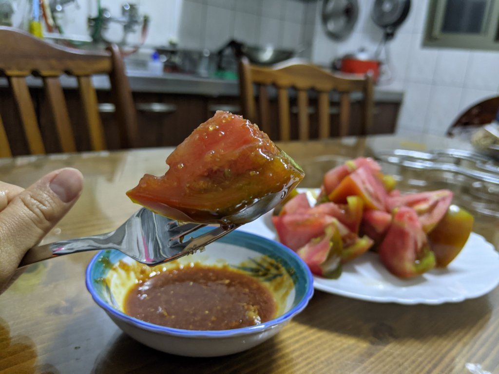 除了懶人搭配法―蕃茄塞酸梅之外,還有一個會被台北同事問的:「你們嘉義人蕃茄還會沾醬吃喔?」(通常是只有那些去嘉義圓環吃過噴水池火雞肉飯,連旁邊七彩冰果室也吃了一輪的外地人,事後會隨口跟我聊起來的常見話題。)