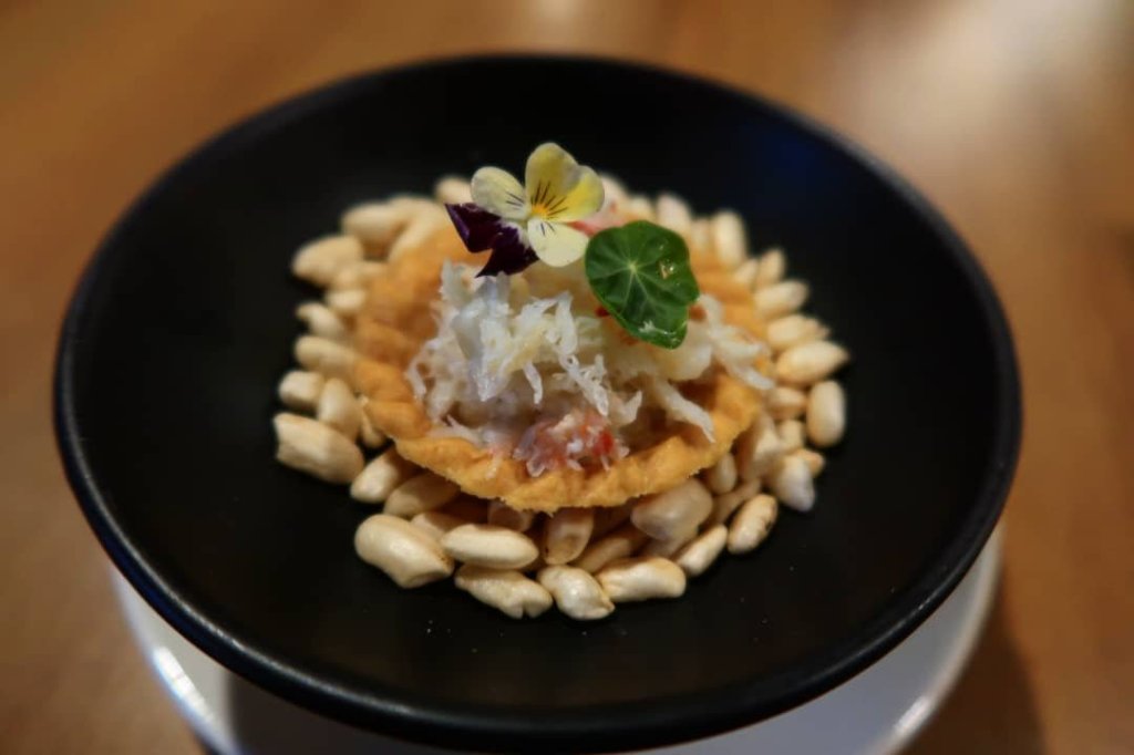 塔皮酥脆帶輕微甜味,底層搭配一點檸檬醬,向上堆疊蒸好特別剔出的松葉蟹肉,頂部點綴三色堇和金蓮葉,煞是可愛。碗裡放了粒粒分明的爆米香,讓同桌長輩吃得相當認真!XD