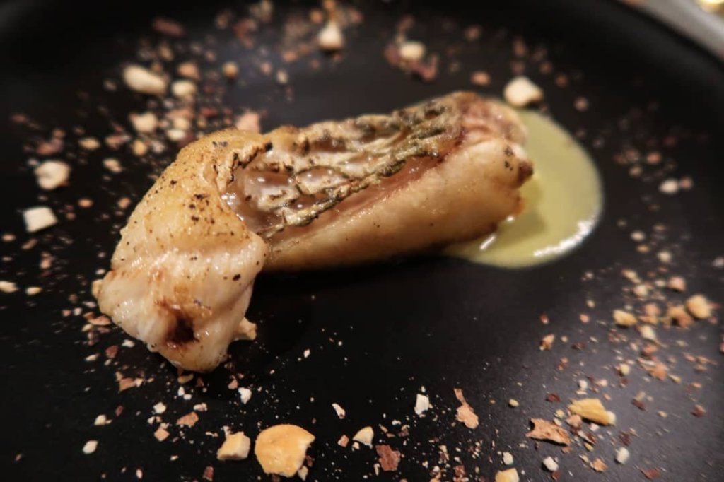 在上桌前幾秒,偷瞄到小為師傅在工作檯用噴槍炙燒過;後來才知道這是特別採用君度橙酒去帶出香味。君度酒搭配小卷這個做法我沒有吃懂,可能是因為我不太懂酒,也可能是我認定食材本身品質優良,所以會覺得小卷本來就沒有腥味,所以不用柑橘精油味去蓋吧?澎湖小卷,超~~~軟的!( º﹃º )我好愛!