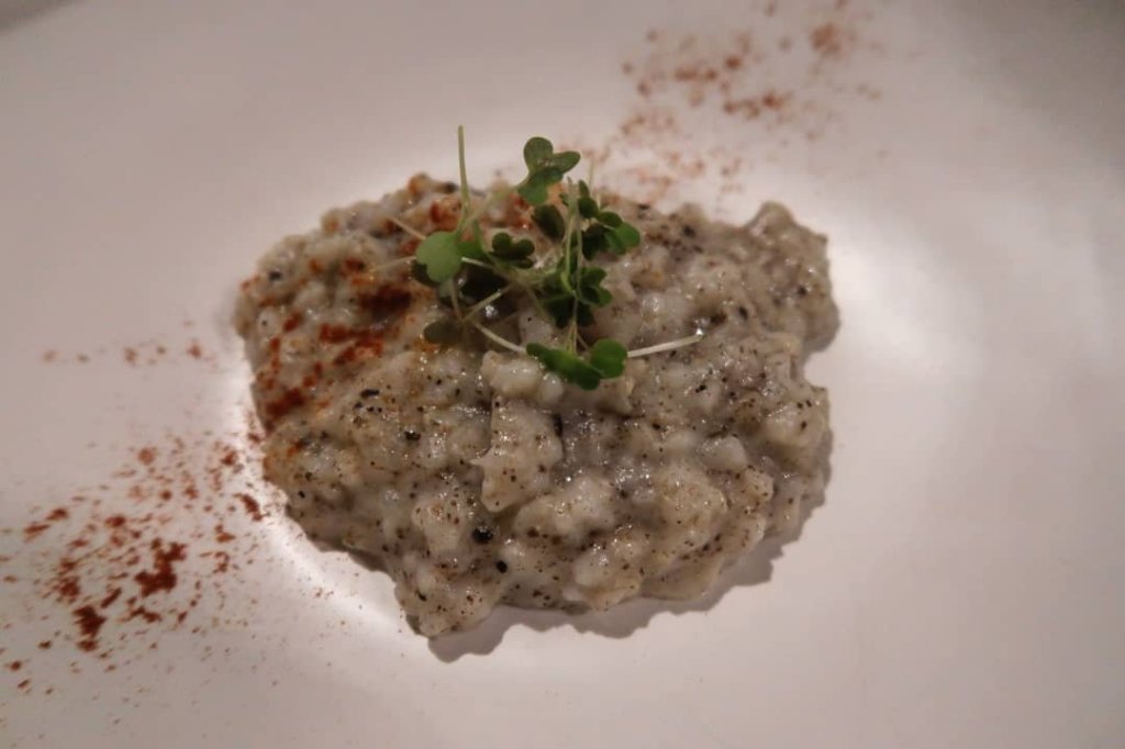 黑松露燉飯旁邊搭配匈牙利紅椒粉,讓香味口味能有變化;上層點綴的芝麻葉苗是出餐前才從盆栽現剪下來的,有著愛心形狀葉片的小可愛!不只增添口感上的層次,更在濃郁中帶入出乎意料的清爽風味。