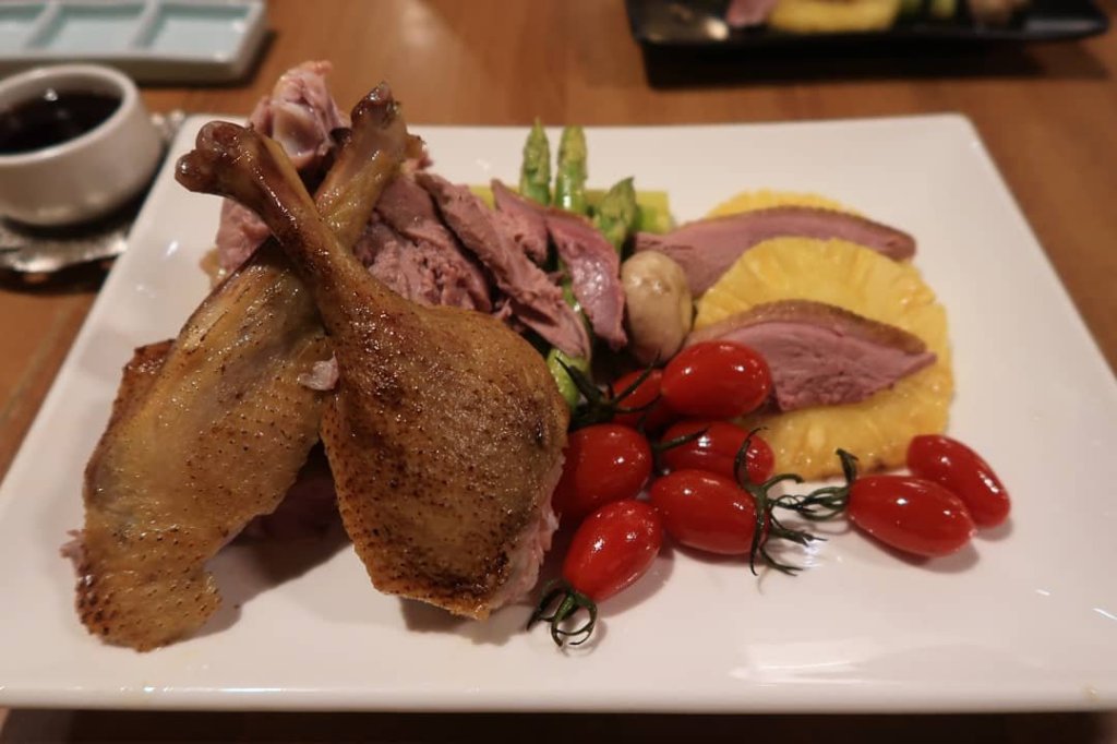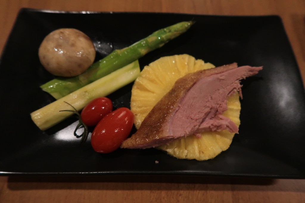 上這道菜的時候,小為師傅會準備好一隻油封全鴨,還會備好這個季節裡盛產的高品質台灣在地蔬果!一邊介紹一邊片下鴨肉給我們吃!