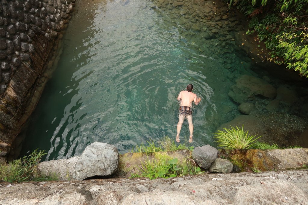 沒有太多猶豫,東部老外脫到剩內褲(他沒有裸泳我就覺得他很克制了!)就往水潭裡跳。