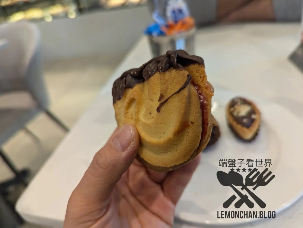 手工餅乾雖然只沾到一點點巧克力榛果醬,但是裡面有滿滿的莓果果醬。