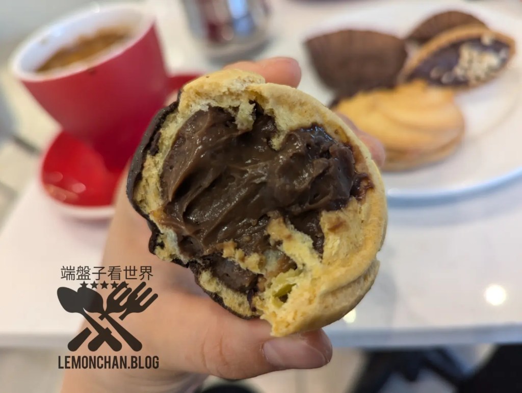 結論:這家店的巧克力泡芙的奶油餡不會膩,雖然不是高凹凹凹級的苦味巧克力,但是甜度不太高。我個人不是螞蟻人也能輕鬆獨自完食一顆,比較怕甜的長輩也可以帶來這家吃泡芙,喝咖啡。